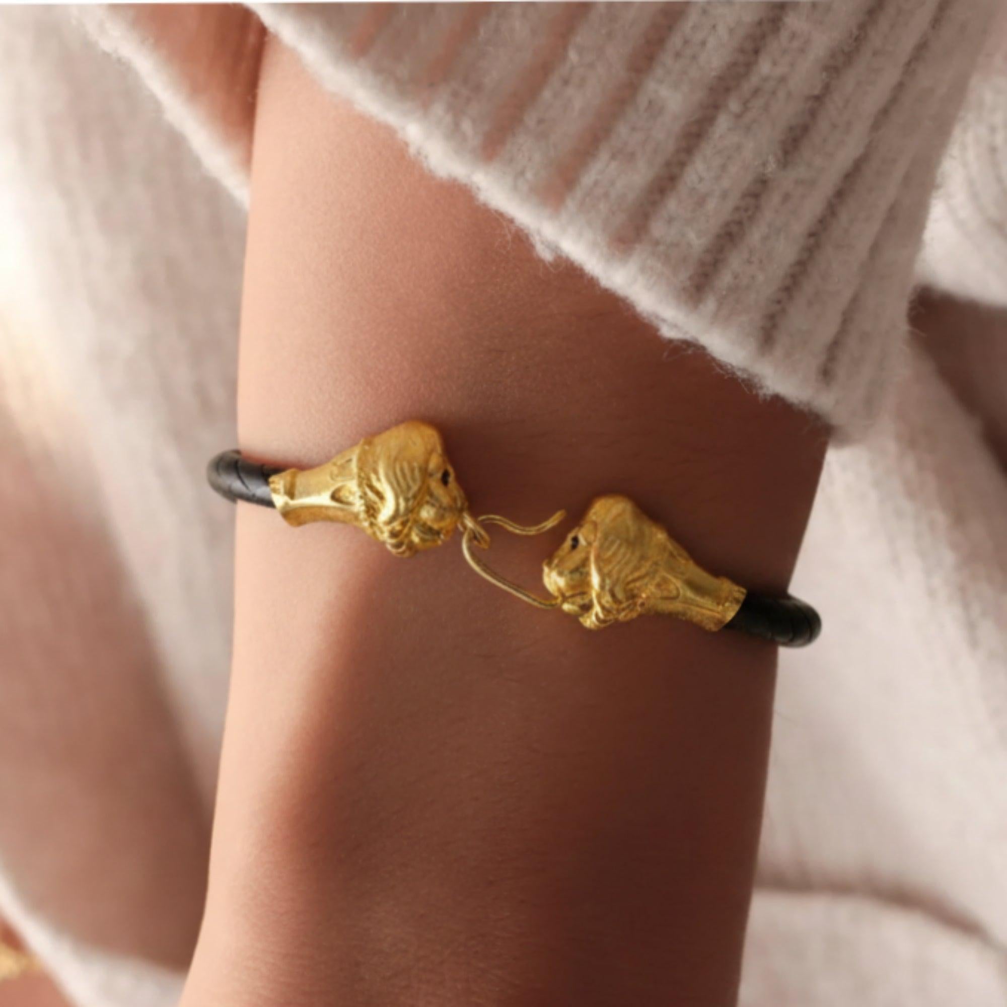 Das Protom, für das alte Römerwar eine künstlerische Darstellung, die die Darstellung des Vorderteils eines Tieres (und in manchen Fällen sogar eines Menschen) als solche sah Leone, Stier und Widder, die oft in Ornamenten und in verwendet wurden Juwelen. Letztere waren vor allem aus Gold gefertigt, um ihre Zugehörigkeit zu den höheren Gesellschaftsschichten zu zeigen. Wird oft mit Tieren in Verbindung gebracht, die als Amulette oder symbolisch gelten. Der Löwe auf diesem Armband ist ein Symbol für große Lebenskraft, Mut, Stolz und Königtum.