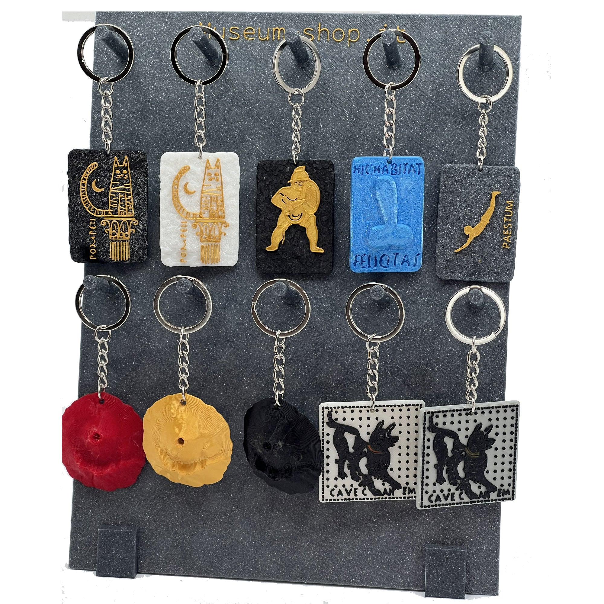 Emporte avec toi un morceau d'histoire avec le Porte-clés “Cave Canem”, inspiré par le célèbre mosaïque romaine de l'ancienne Pompéi qui représente un chien de garde accompagné de l'avertissement “Attention au chien”.